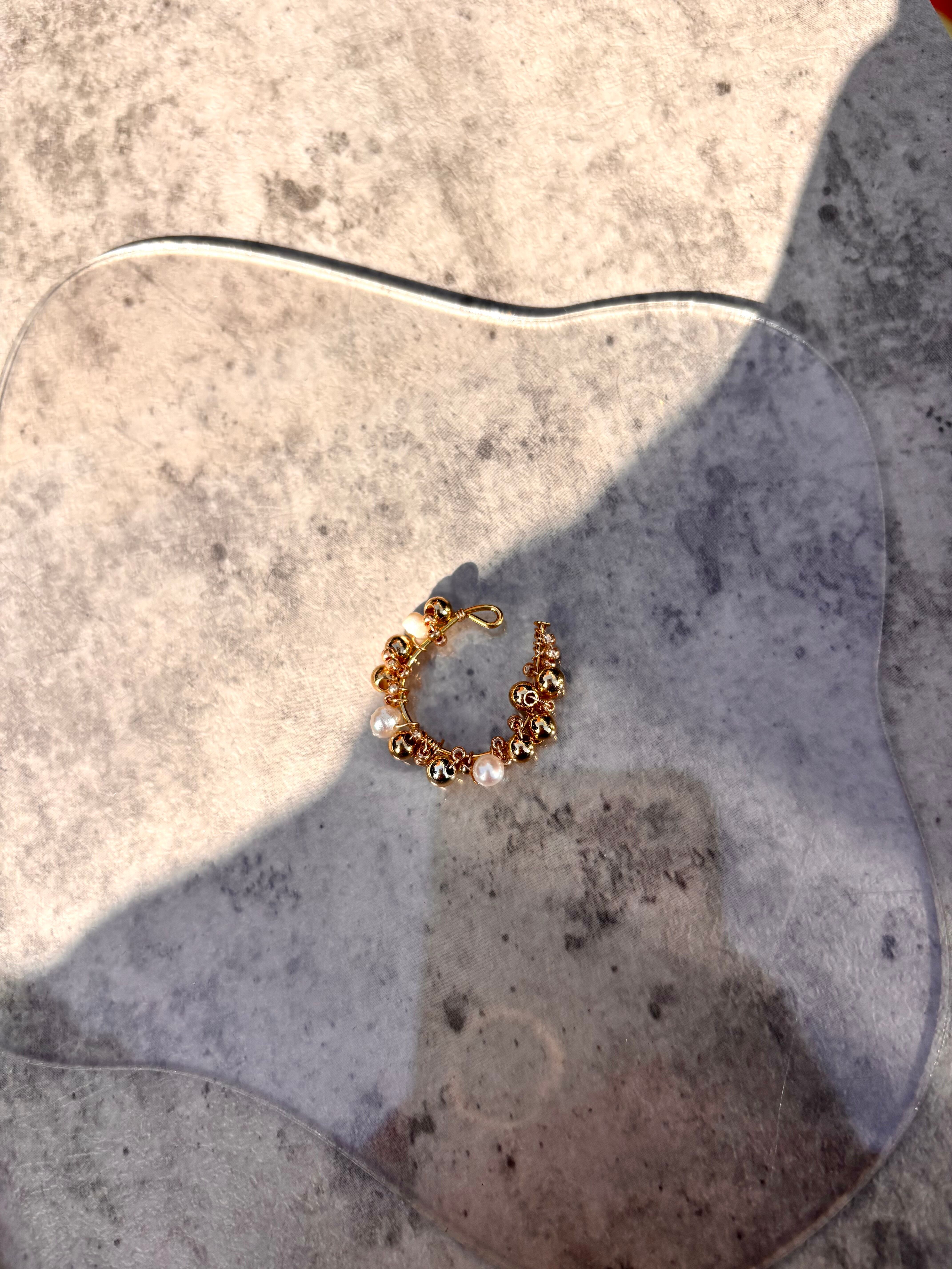 ゴールドビーズとシェルでデザインした春を感じるイヤーカフです。