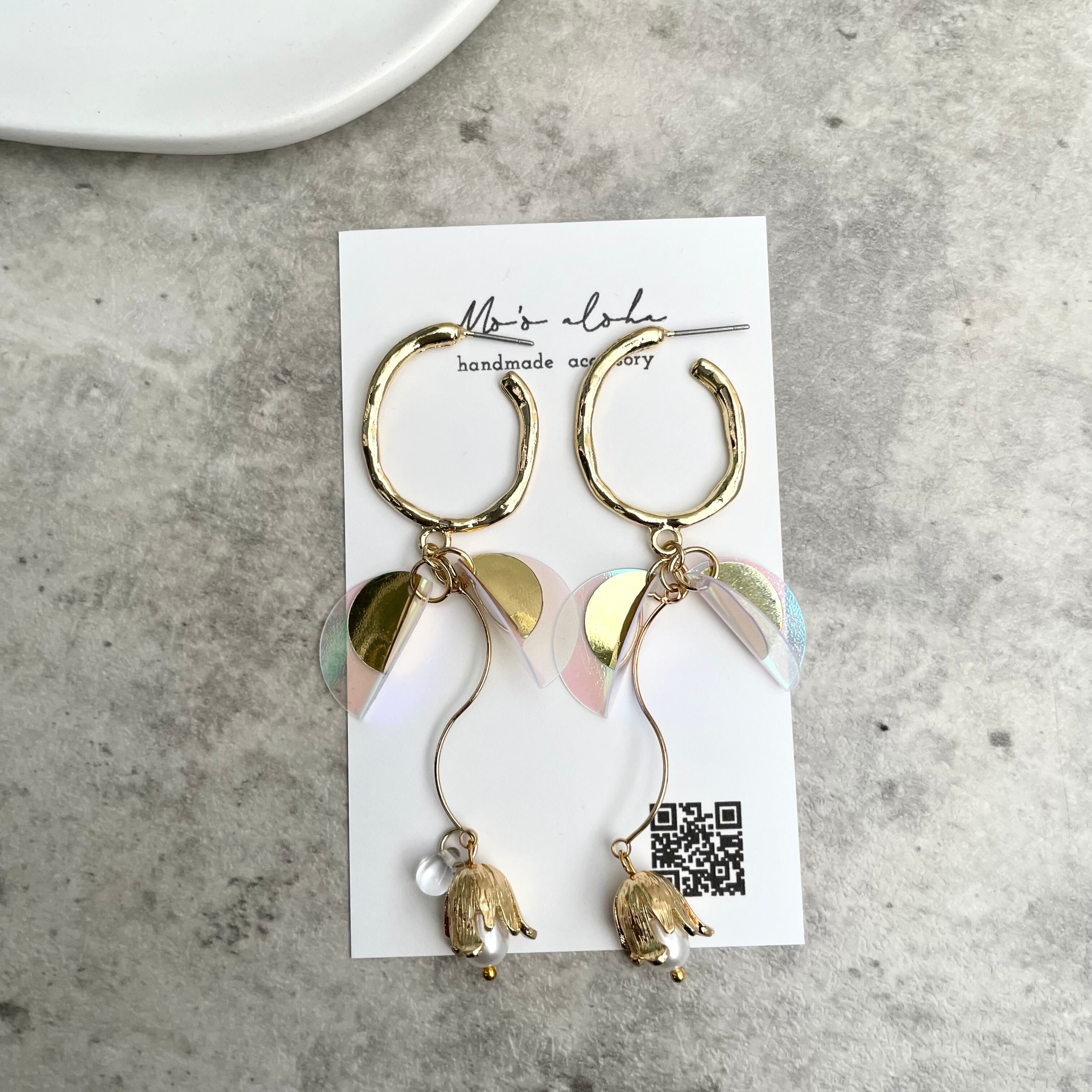 スパンコールにお花の蕾に淡水パールとクリアビーズをあしらったキュートで目を引くデザインです✨